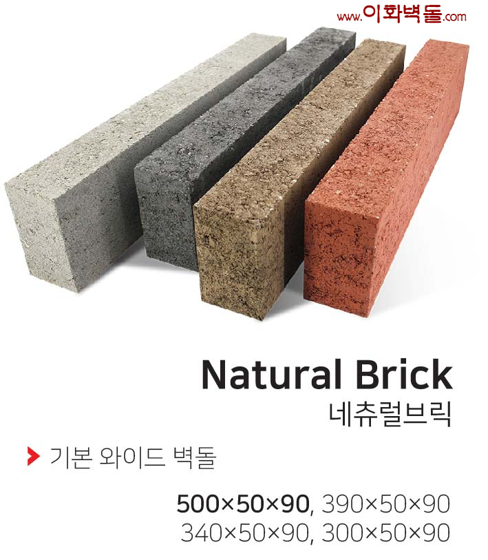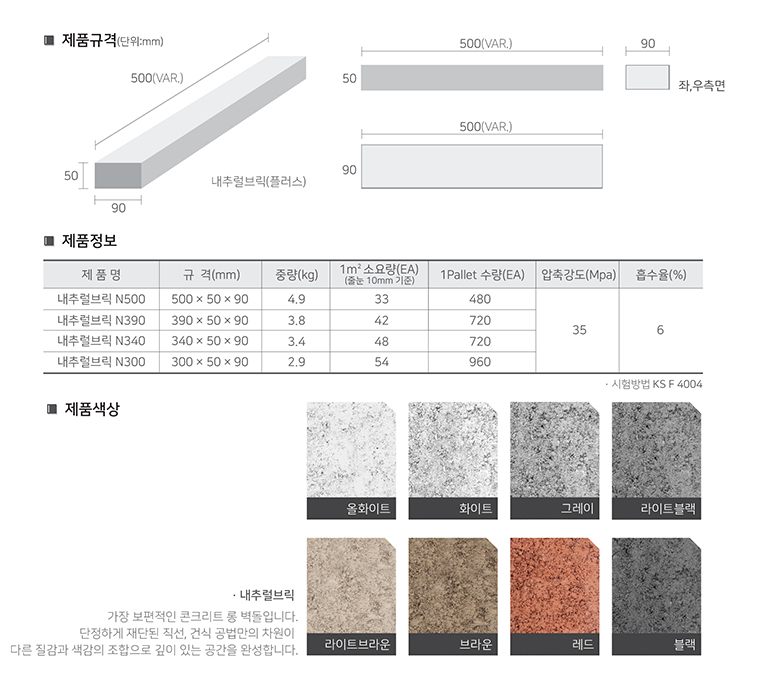 규격 : 500x90x50 m²당 : 30장(줄눈10mm기준) 포장 : 1p/480장 장당 중량 4.5kg