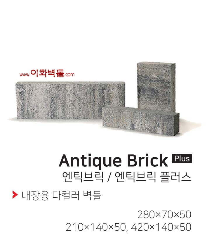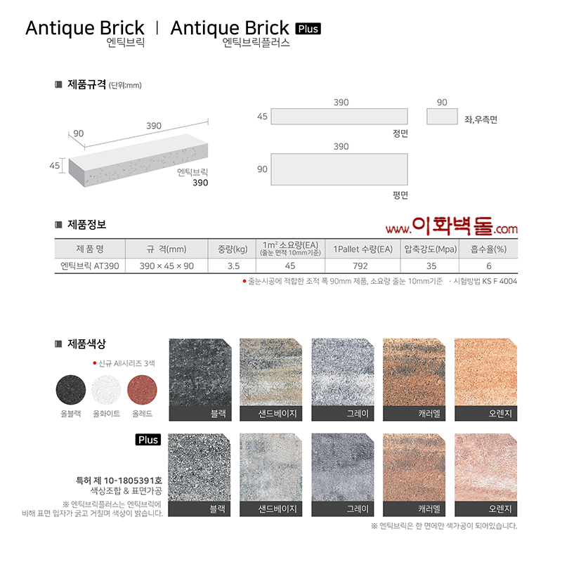 제품명 : 엔틱브릭플러스 규격 : 390x45x90 m²당 : 45장(줄눈10mm기준) 포장 : 1p/792장 장당 중량 3.5kg 용도 : 신축건물치장 / 건물외벽재시공 / 실내외인테리어 / 영롱쌓기