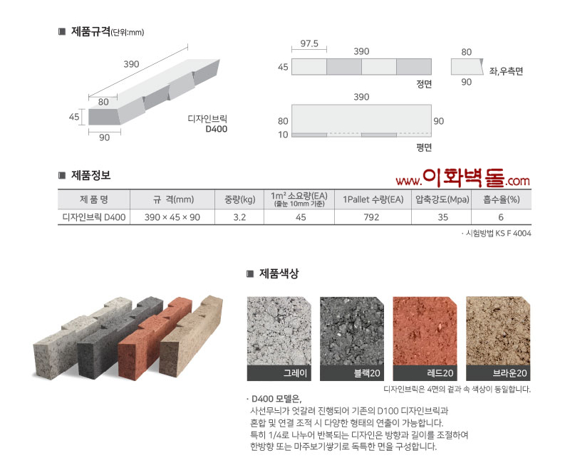 제품명 : 디자인브릭 D400 규격 : 390x45x90 m²당 : 45장(줄눈10mm기준) 포장 : 1p/792장 장당 중량 3.2kg 용도 : 신축건물치장 / 건물외벽재시공 / 실내외인테리어 / 영롱쌓기
