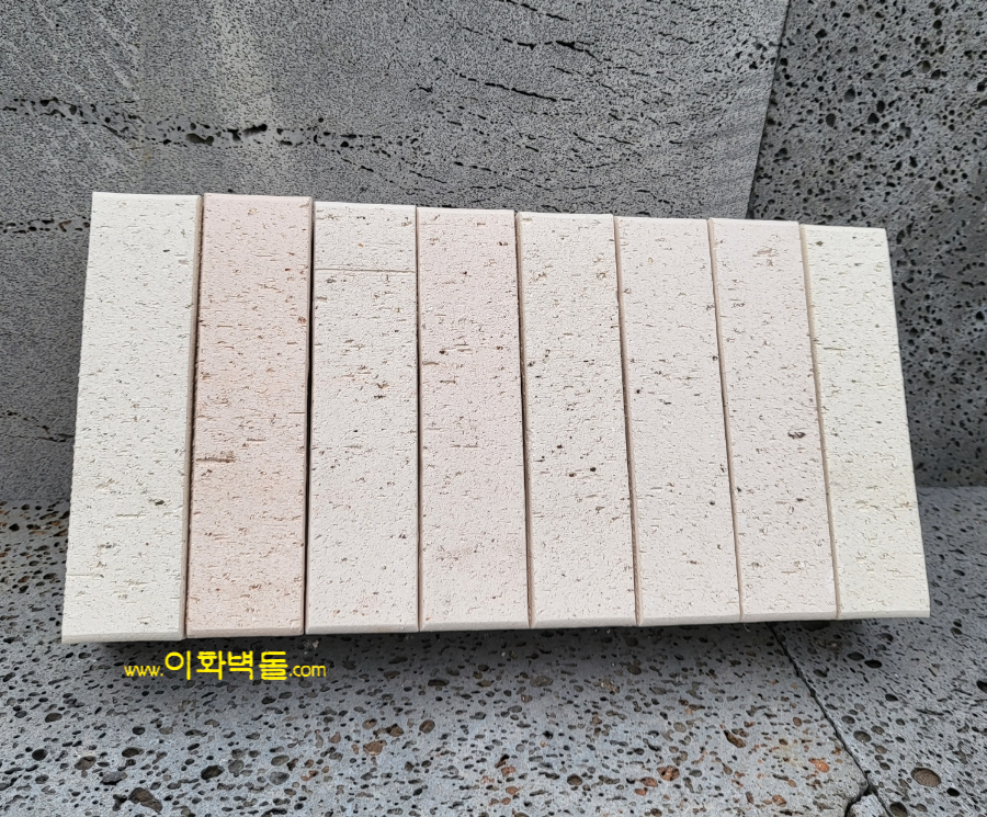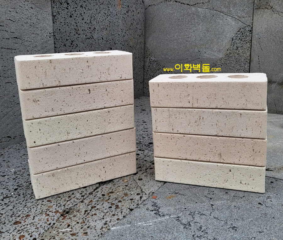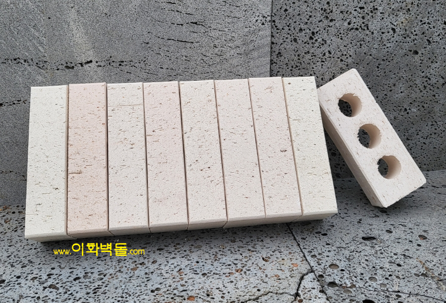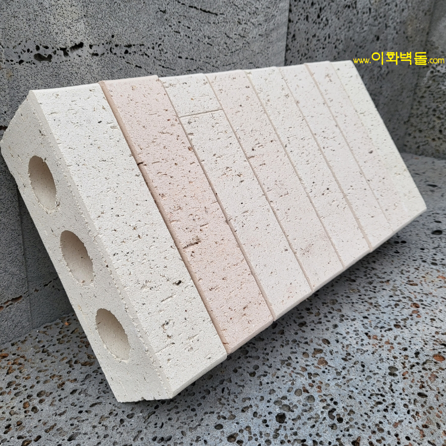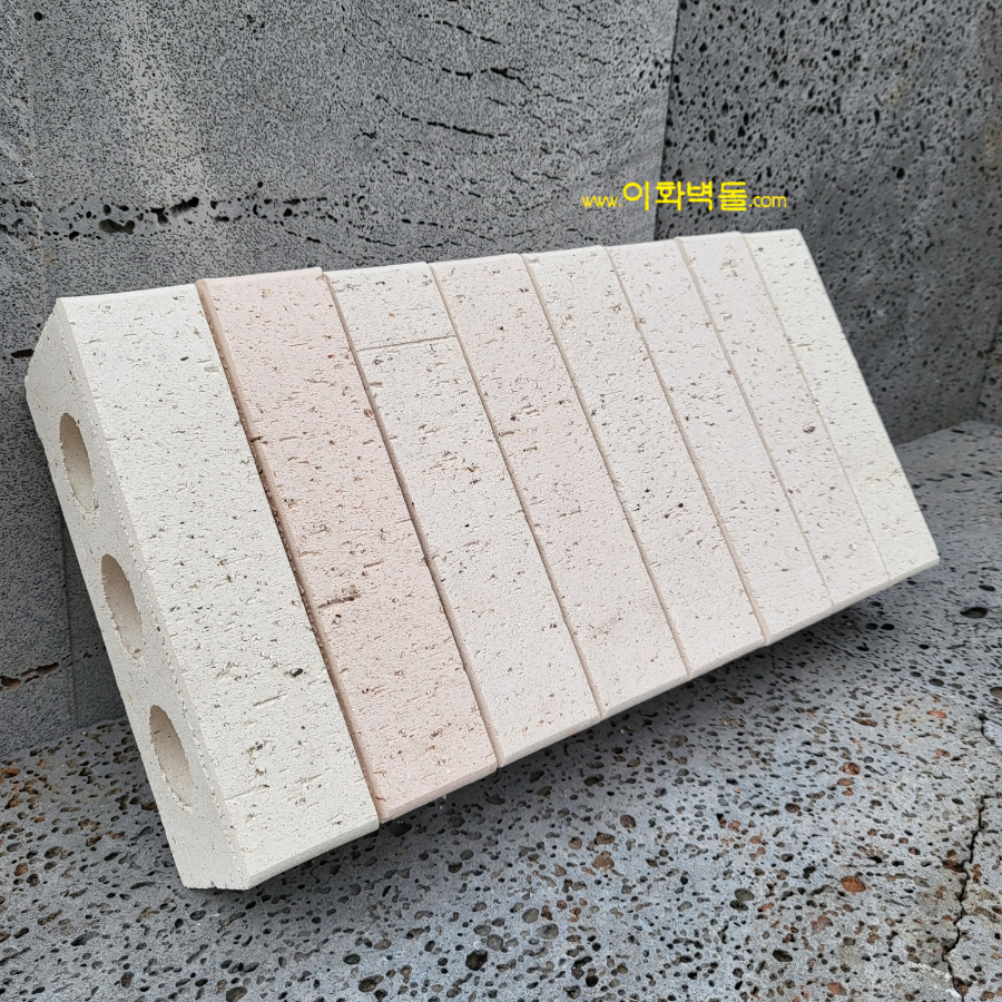 제품명 : 핑크화이트 규격 : 230x90x57 m²당 : 60장(줄눈15mm기준) 1p/1105장 용도 : 신축건물치장 / 건물외벽시공 / 실내인테리어 특징 : 1200℃ 이상의 온도로 구워낸 점토벽돌