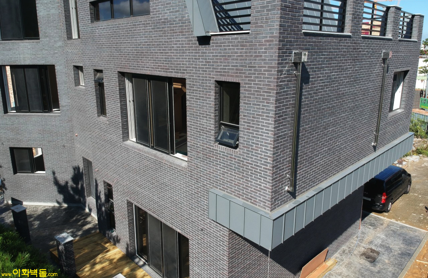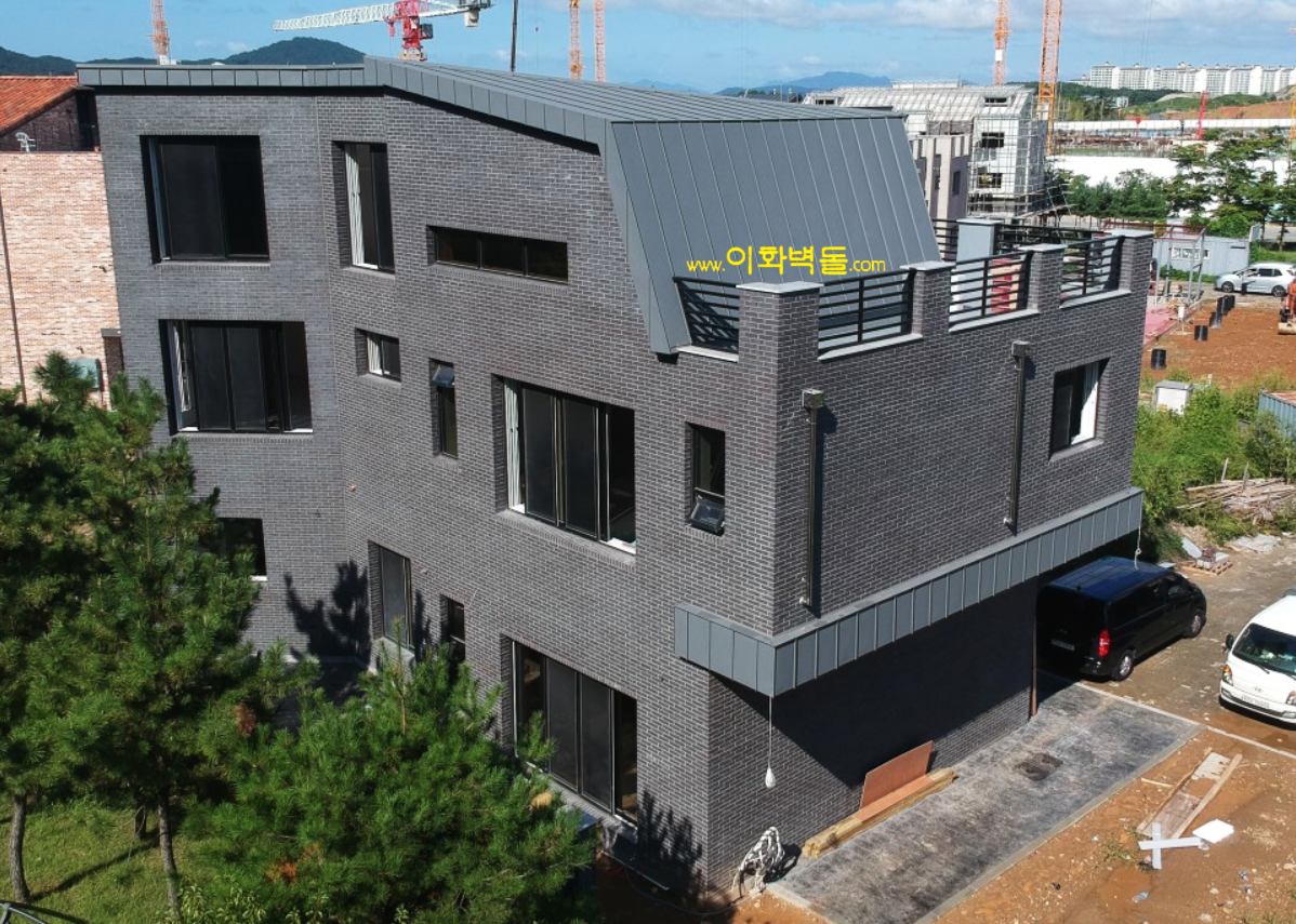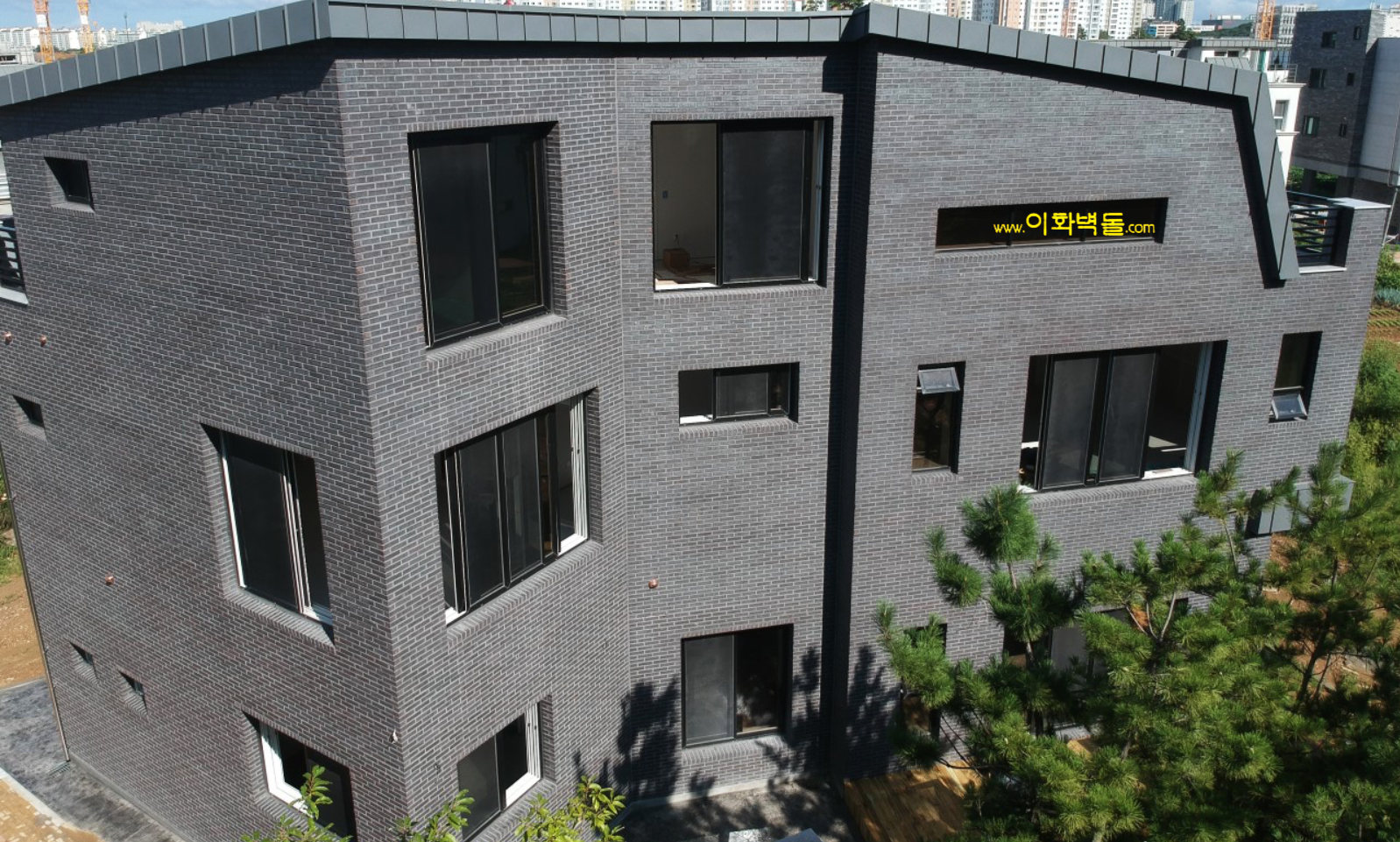 블랙홀(9장) + 밀키웨이(1장) = 스페이스 A 제품명 : 블랙홀 규격 : 230x90x57 m²당 : 60장(줄눈15mm기준) 1p/1,020장 장당중량 : 1.8kg / 1p중량 1836kg / 25톤차 15p = 15,300장 = 27,540kg 용도 : 신축건물치장 / 건물외벽시공 / 실내인테리어 특징 : 1200℃ 이상의 온도로 구워서 만들어진 푸르스름한 검정계통 점토유약벽돌