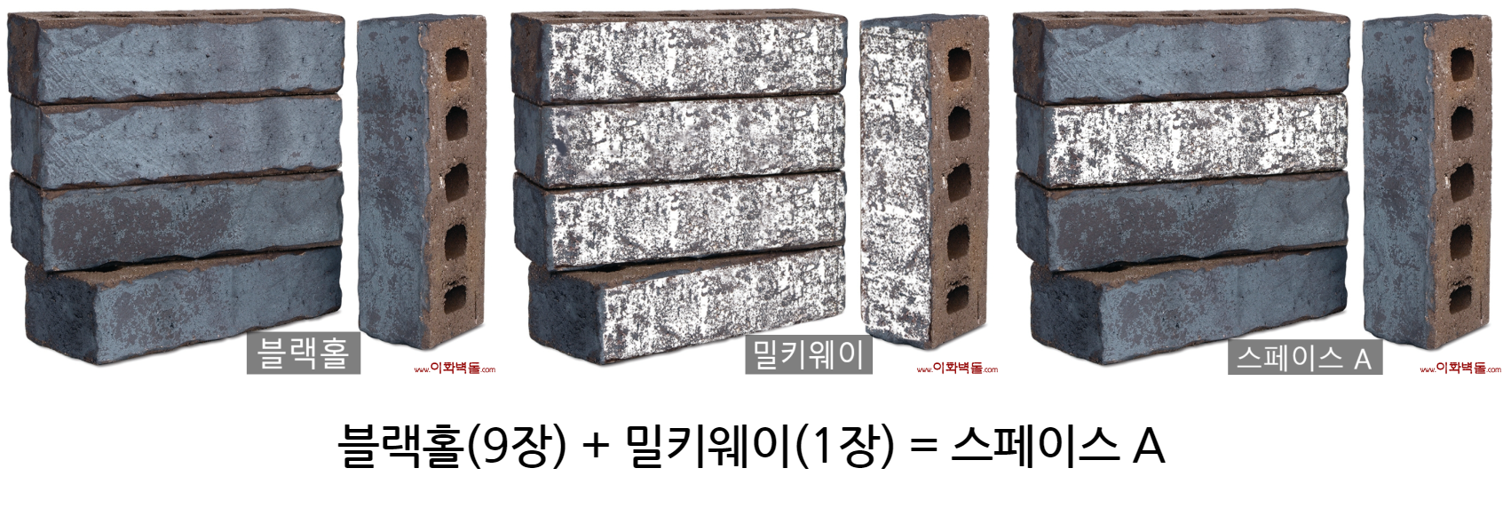 제품명 : 스페이스 A 규격 : 230x90x57 m²당 : 60장(줄눈15mm기준) 1p/1,020장 장당중량 : 1.8kg / 1p중량 1836kg / 25톤차 15p = 15,300장 = 27,540kg 용도 : 신축건물치장 / 건물외벽시공 / 실내인테리어 특징 : 블랙홀 벽돌에 밀키웨이벽돌을 10% 포인트 믹스한 칼라유약벽돌