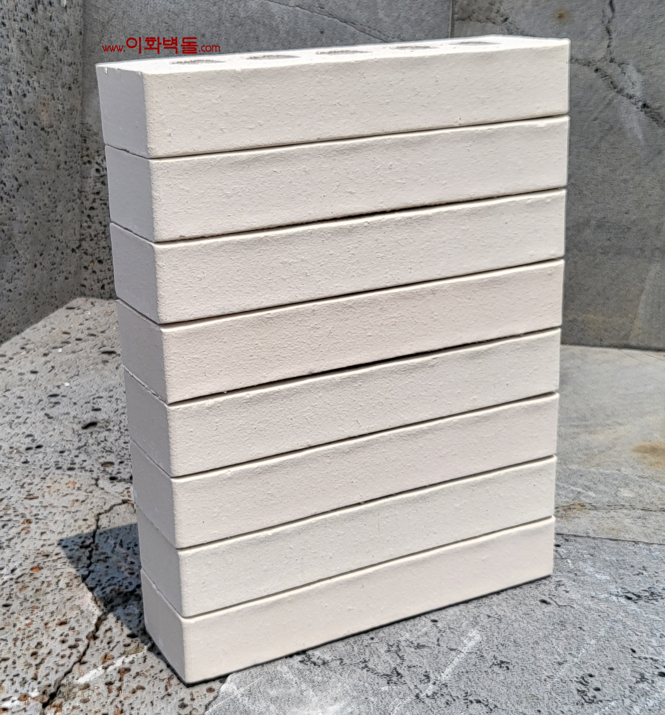제품명 : 올 화이트 규격 : 300x90x50 m²당 : 49장(줄눈15mm기준) 1p/1040장 용도 : 신축건물치장 / 건물외벽시공 / 실내인테리어 특징 : 1200℃ 이상의 온도로 구워낸 점토벽돌