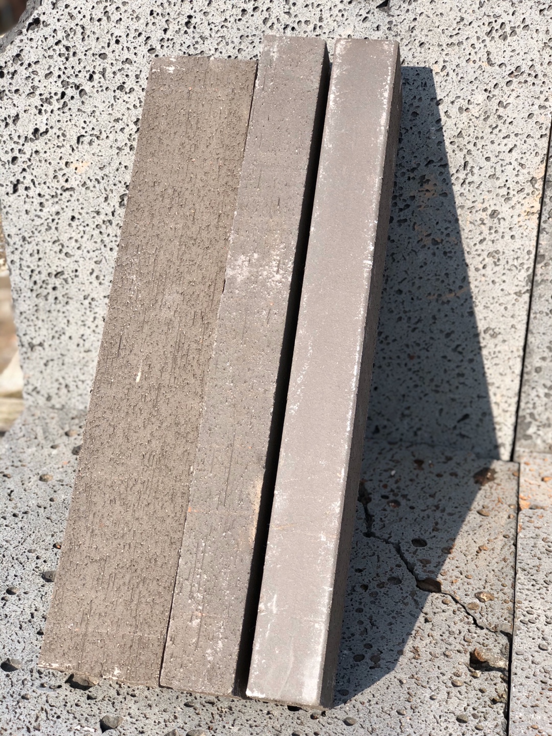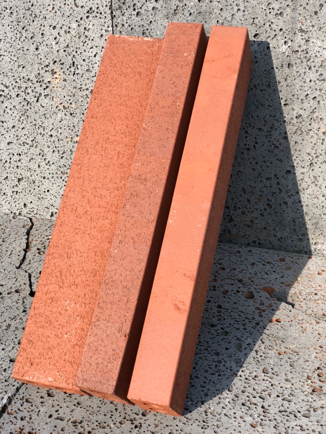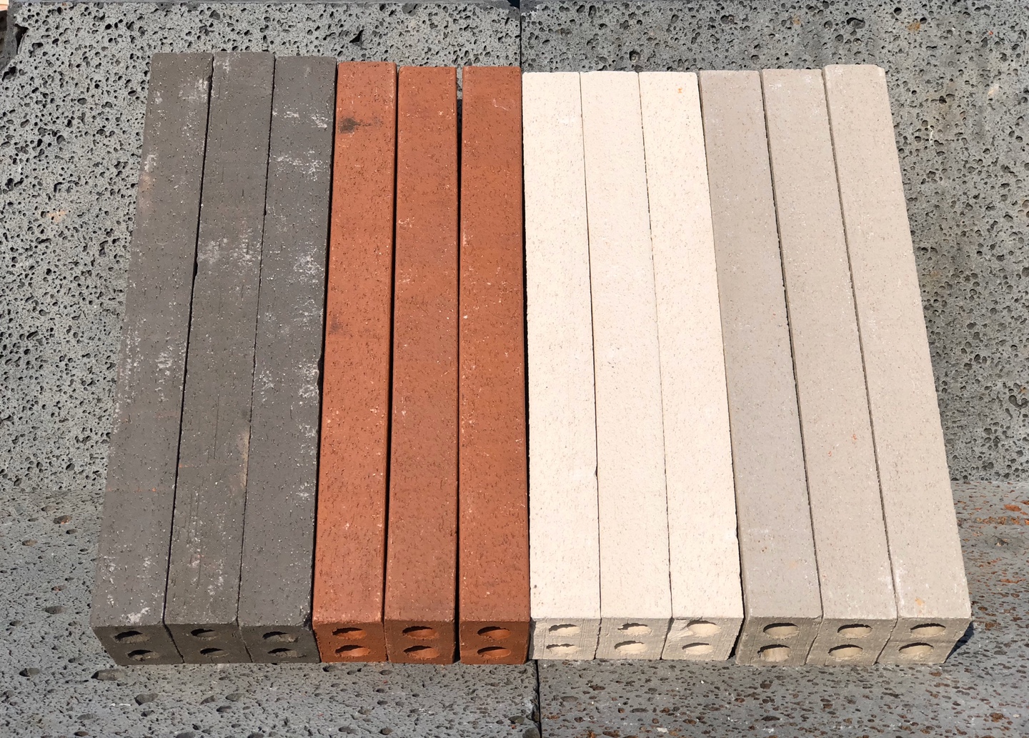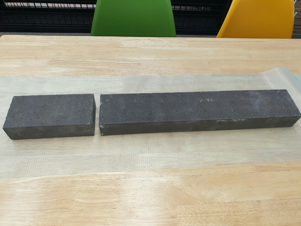 500사이즈 벽돌로 옆면에 구멍이 있으며 50부분의 한면은 면이 고운 미장 면이고 다른 한면은 토석 면입니다