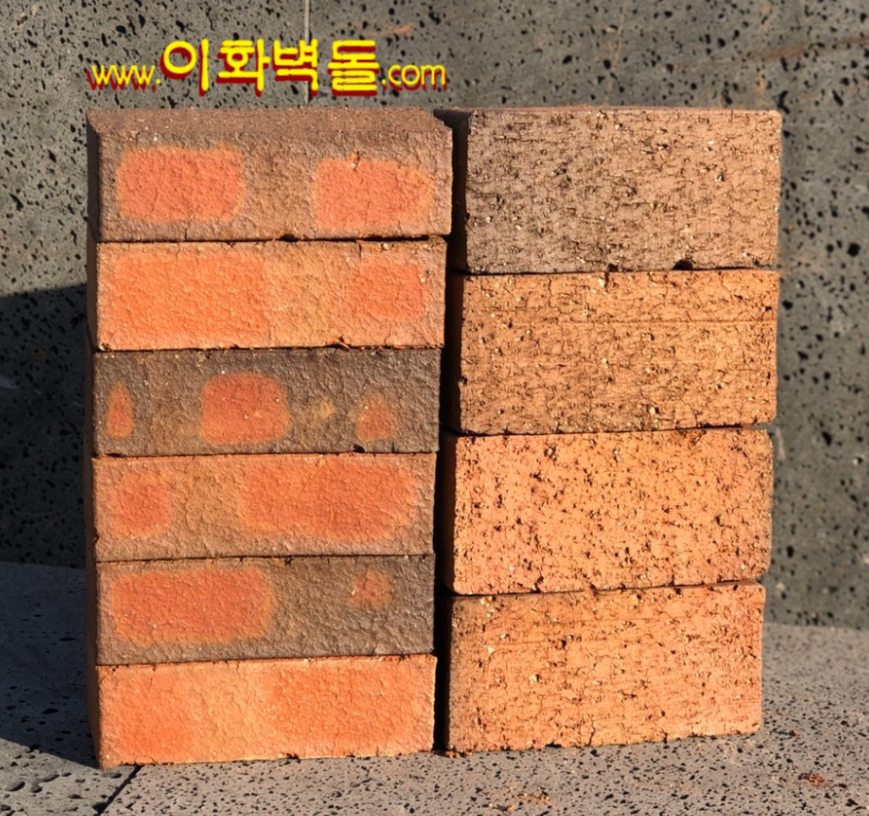 환원벽돌 무공 size : 190x90x57 / 헤배당 75장 1p / 1300장 구멍이 없는 제품으로 바닥에 같이 시공이 가능한 벽돌입니다. 맨 마지막 사진은 환원벽돌과 변색벽돌 2가지 제품 사진입니다.
