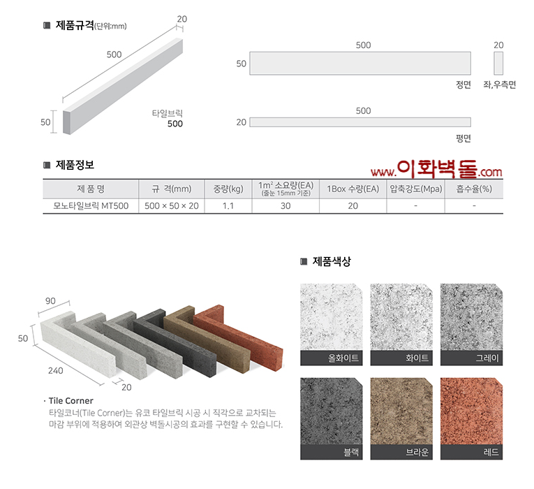 제품명 : 모노타일브릭 타일 규격 : 500x50x20 m²당 : 30장(줄눈10mm기준) 포장 : 1박스/20장 장당 중량 1kg 코너타일 규격 : 240*90x50x20 색상 : 화이트 / 그레이 / 블랙 / 브라운 / 레드 용도 : 신축건물치장 / 건물외벽재시공 / 실내외인테리어