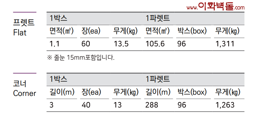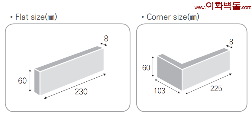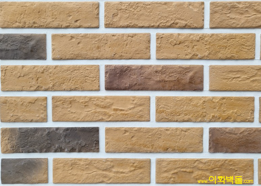 터치브릭 옐로우 타일규격 : 230x60x8T 박스 당 / 1.1m² / 60장 / 13.5kg / 1p / 96박스 / 105.6m² / 1.311kg 코너규격 : 225*103x60x8T 박스 당 / 3m / 40장 / 13kg / 1p / 96박스 / 288m / 1.263kg