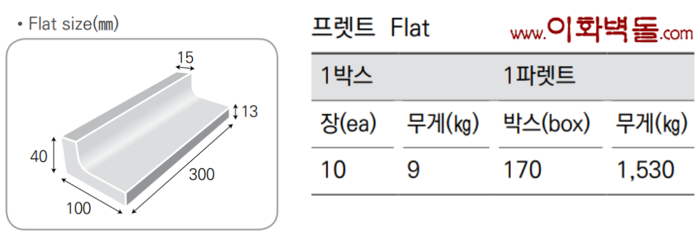 제품명 : 계단마감석 규격 : 300x100x40x15x13T 1box / 10장 / box중량 -9kg 1p / 170box / 1p중량 -1,530kg 테라코타바닥재의 마감재로 사용. 마감선이 깔끔합니다. [이 게시물은 이화적벽돌님에 의해 2022-11-14 10:20:18 바닥벽돌에서 복사 됨]