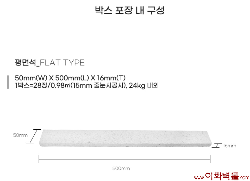 제품명 : 뉴 스노우 화이트 모노타일 블랙 모노타일 / 규격 : 500×50×16 m²당 : 28장 1박스 / 28장 / 0.98m²(줄눈15mm기준) / 24kg 용도 : 신축건물치장 / 건물외벽 재시공 / 실내인테리어