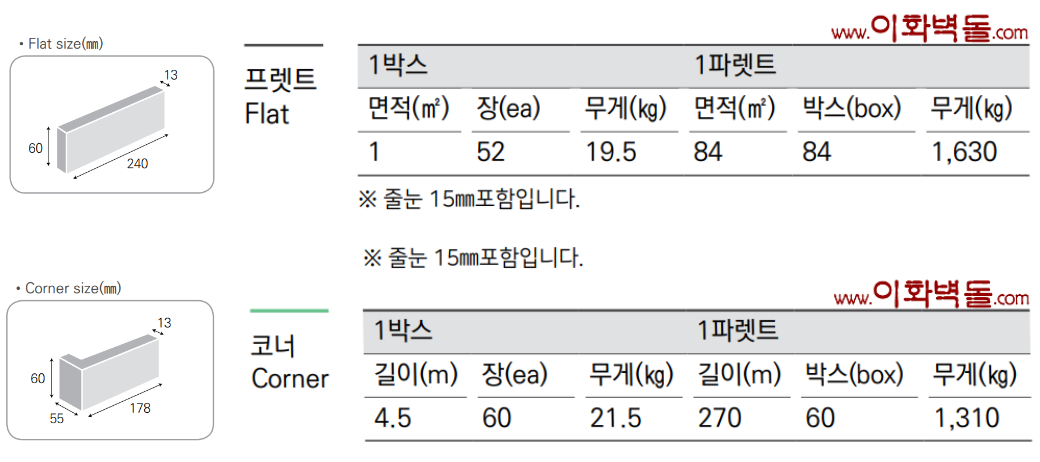 코너 SIZE : 178x60x55x13T m당/13.3장 (줄눈15mm기준)
