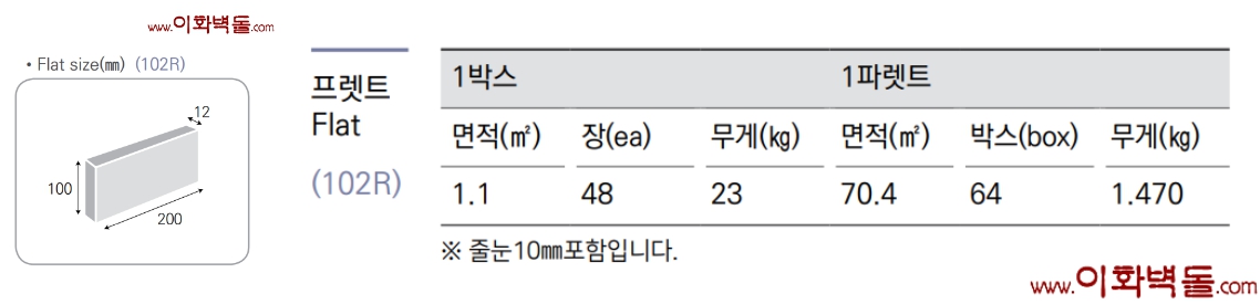 제품명 : 테라코타 102바닥벽돌 규격 : 200x100x12 m²당 : 48장(줄눈10mm기준) 1box 48장 1.1헤배 1박스 23kg 1p 64box 70.4헤배 1p 중량 1,470kg