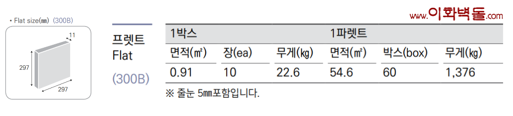 제품명 : 테라코타300바닥벽돌 블랙 규격 : 297x297x11 m²당 : 10장 1box 10장 1박스당 0.91헤배 22.6kg 1p 60box 54.6헤배 1p 중량 1,376kg