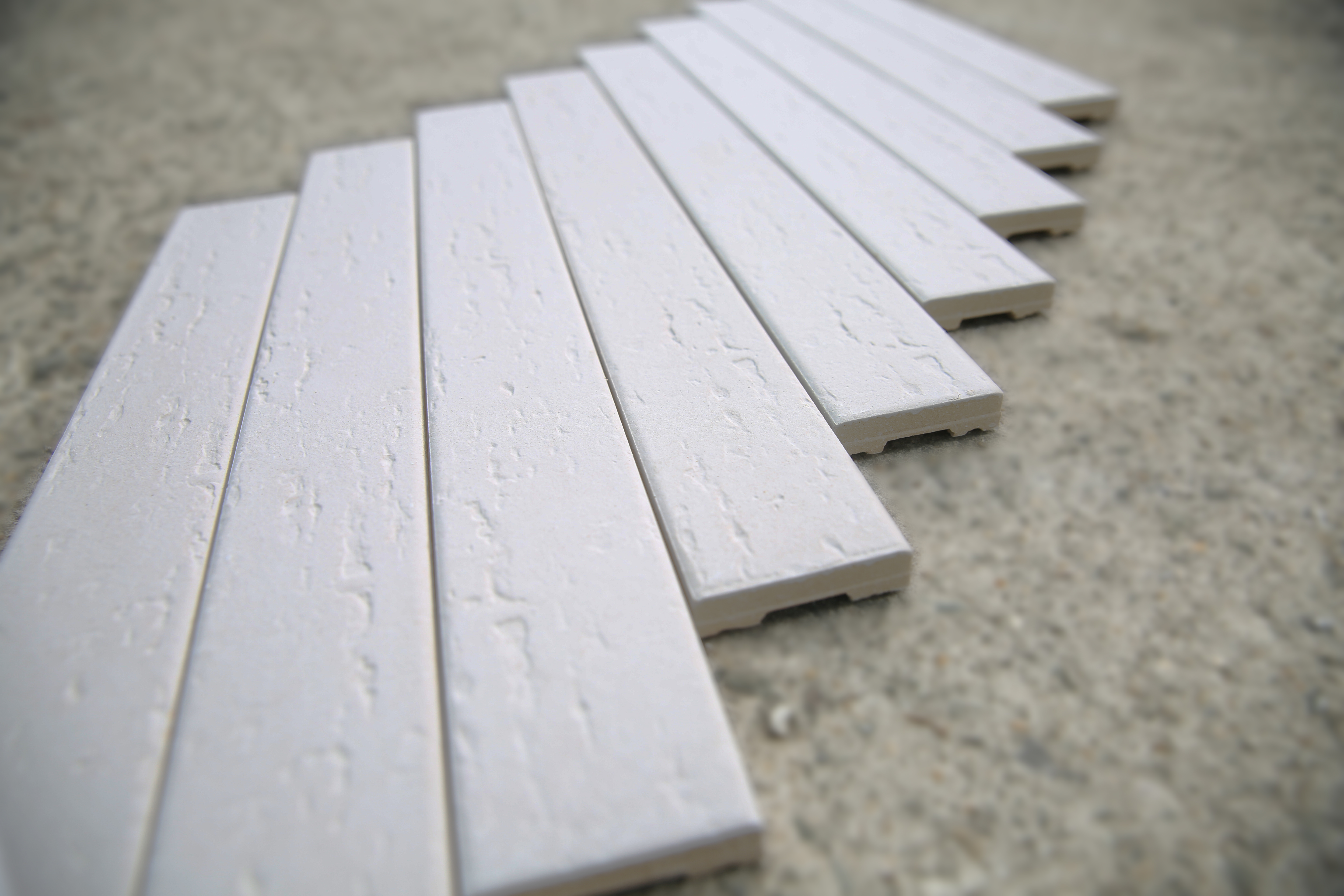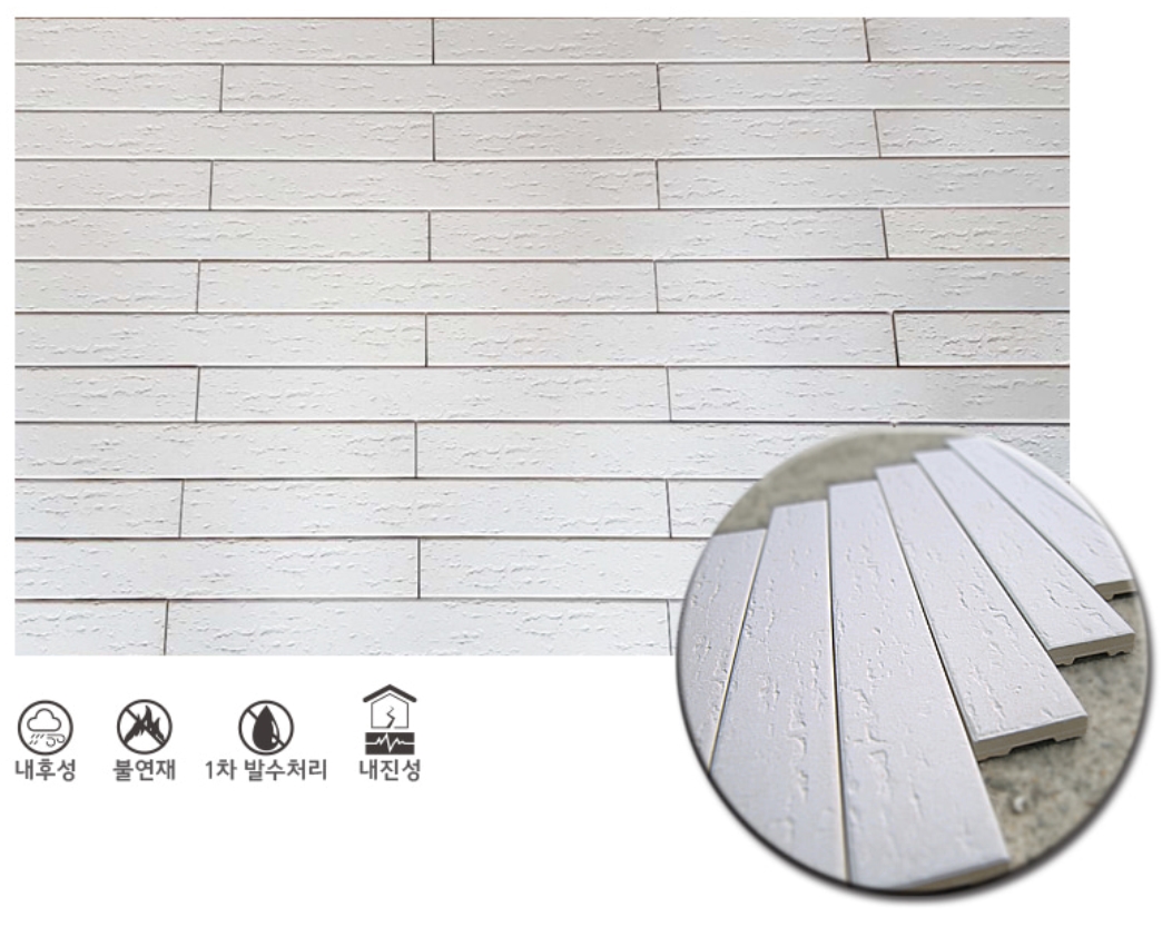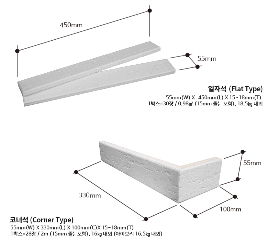 화이트 롱브릭타일 SIZE : 450x55x15~18T 1박스당 / 30장 / 18.5kg / 0.98m² (줄눈15mm기준) 화이트 롱브릭코너타일 SIZE : 330x55x100x15~18T 1박스당 / 28장 / 16.5kg / 2m (줄눈15mm기준)