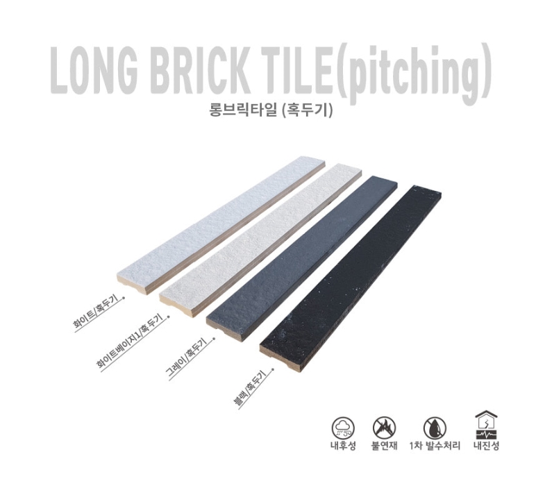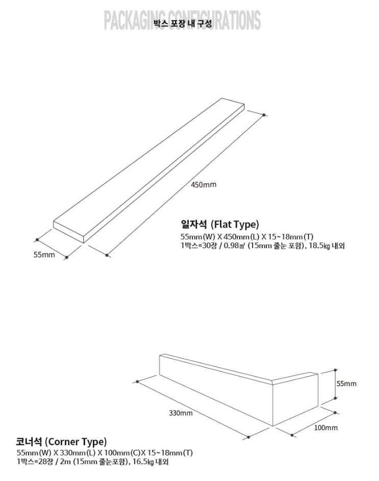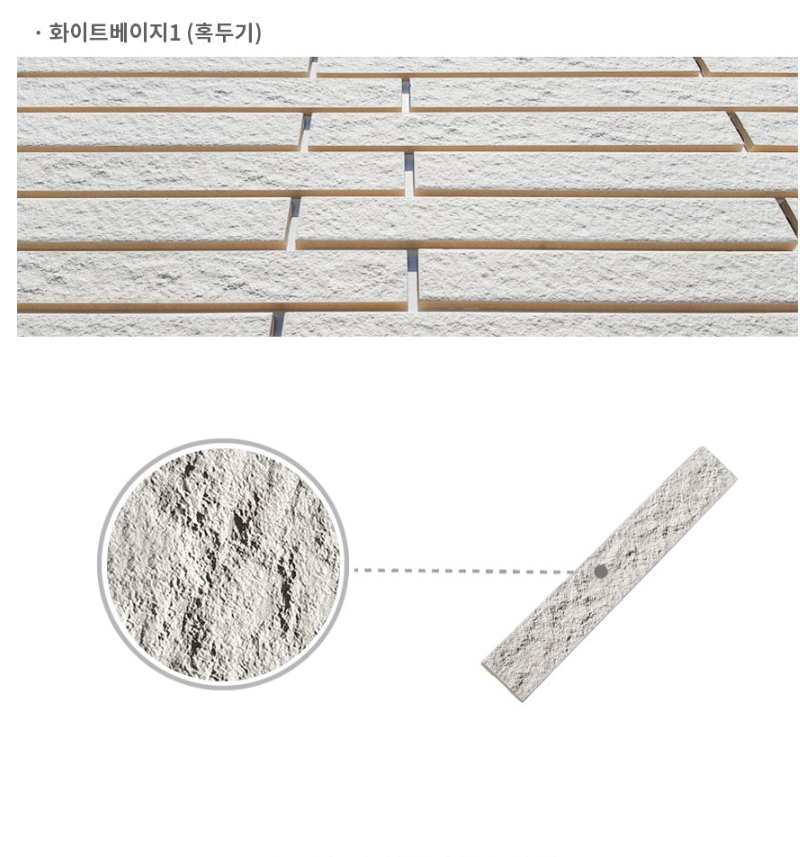 혹두기 화이트베이지1 롱브릭타일 SIZE : 450x55x15~18T 1박스당 / 30장 / 18.5kg / 0.98m² (줄눈15mm기준) 혹두기 화이트베이지1 롱브릭코너타일 SIZE : 330x55x100x15~18T 1박스당 / 28장 / 16.5kg / 2m (줄눈15mm기준)