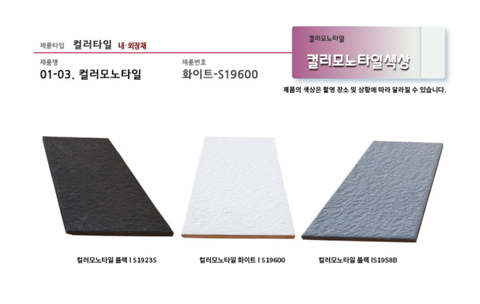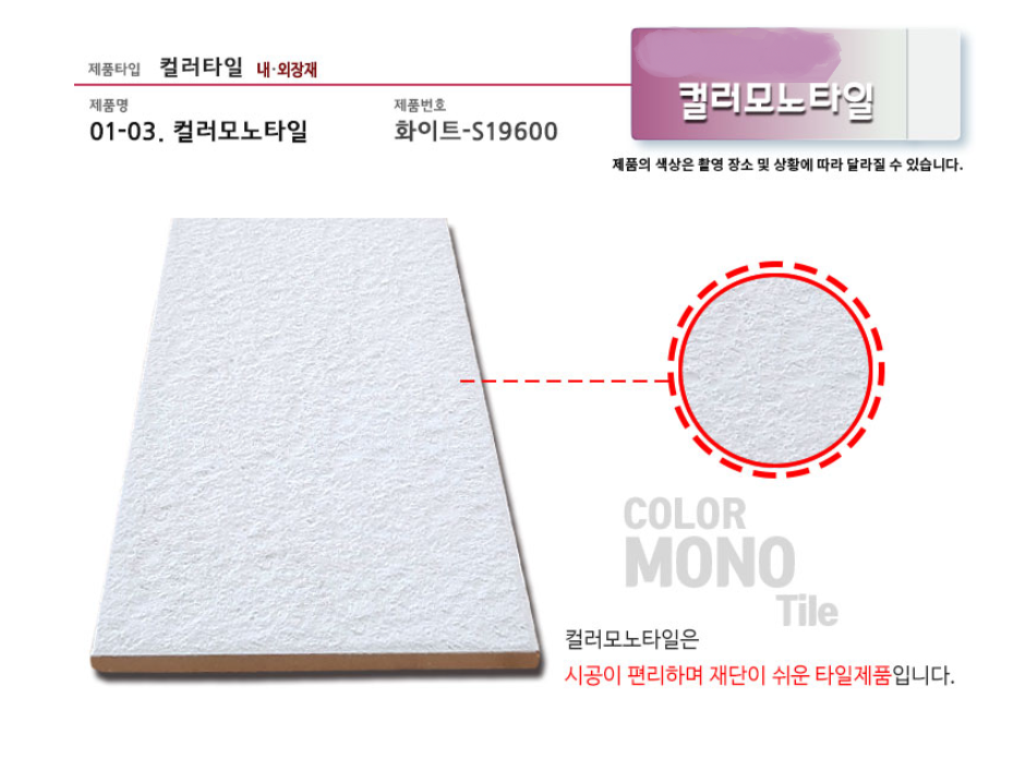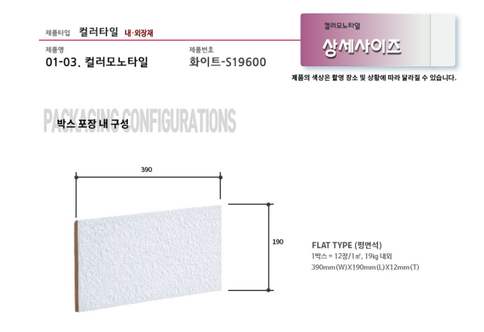 컬러모노타일 화이트 SIZE : 390 x 190 x 15T m²/12장 1박스당 / 12장 / 20kg / 0.98m² (줄눈15mm기준) 10여 가지의 메지(줄눈시멘트) 칼라로 다양한 시공패턴 연출, 메지(줄눈시멘트) 차이로 다른 분위기를 냅니다.