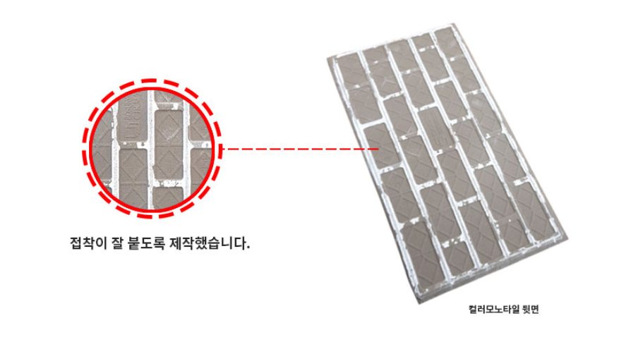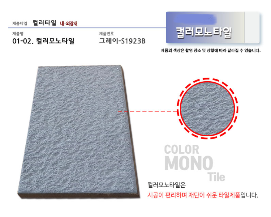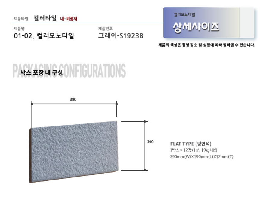 컬러모노타일 그레이 SIZE : 390 x 190 x 15T m²/12장 1박스당 / 12장 / 20kg / 0.98m² (줄눈15mm기준) 10여 가지의 메지(줄눈시멘트) 칼라로 다양한 시공패턴 연출, 메지(줄눈시멘트) 차이로 다른 분위기를 냅니다.