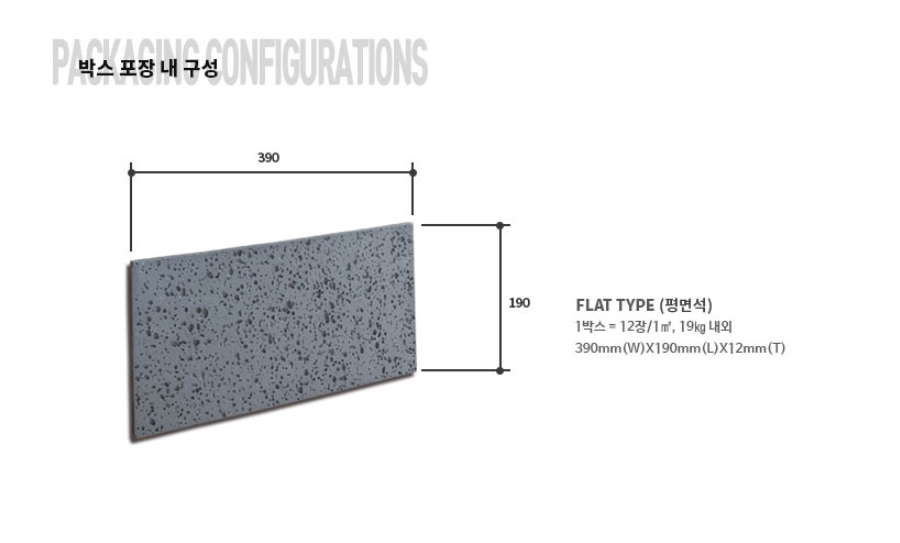컬러현무암타일 그레이 SIZE : 390 x 190 x 15T m²/12장 1박스당 / 12장 / 20kg / 0.98m² (줄눈15mm기준) 10여 가지의 메지(줄눈시멘트) 칼라로 다양한 시공패턴 연출, 메지(줄눈시멘트) 차이로 다른 분위기를 냅니다.