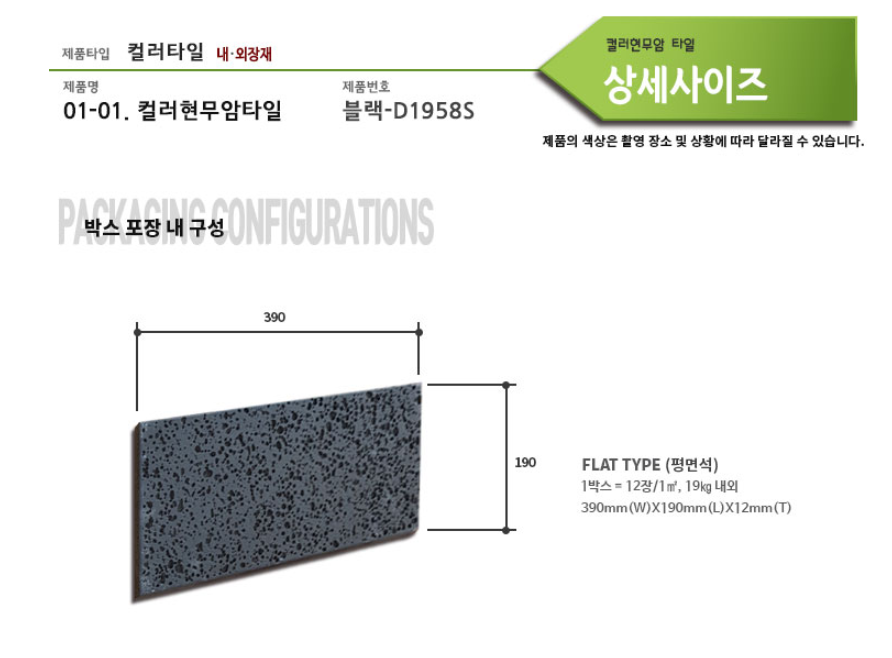 컬러현무암타일 블랙 SIZE : 390 x 190 x 15T m²/12장 1박스당 / 12장 / 20kg / 0.98m² (줄눈15mm기준) 10여 가지의 메지(줄눈시멘트) 칼라로 다양한 시공패턴 연출, 메지(줄눈시멘트) 차이로 다른 분위기를 냅니다.