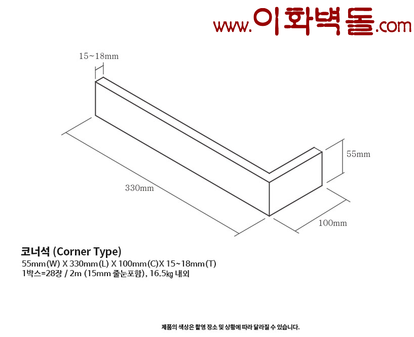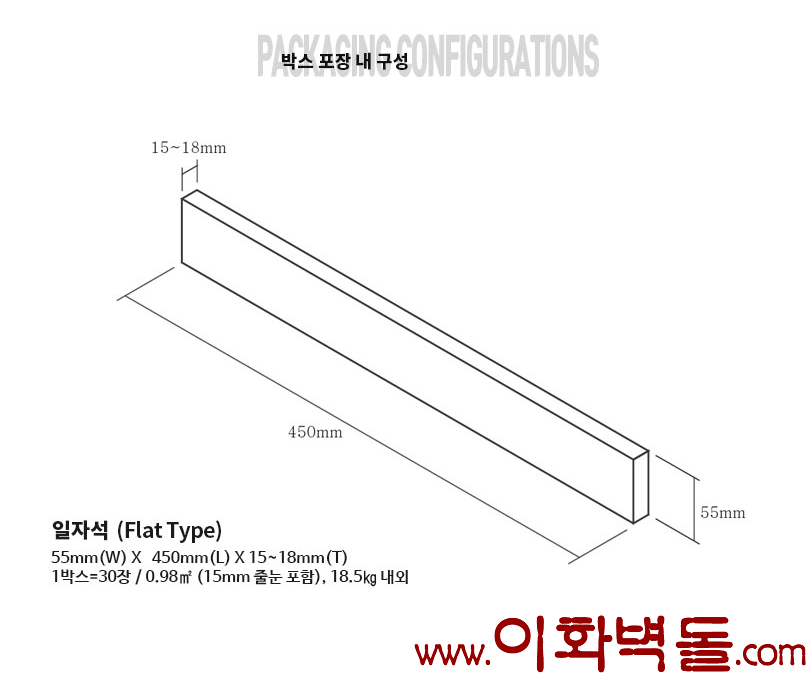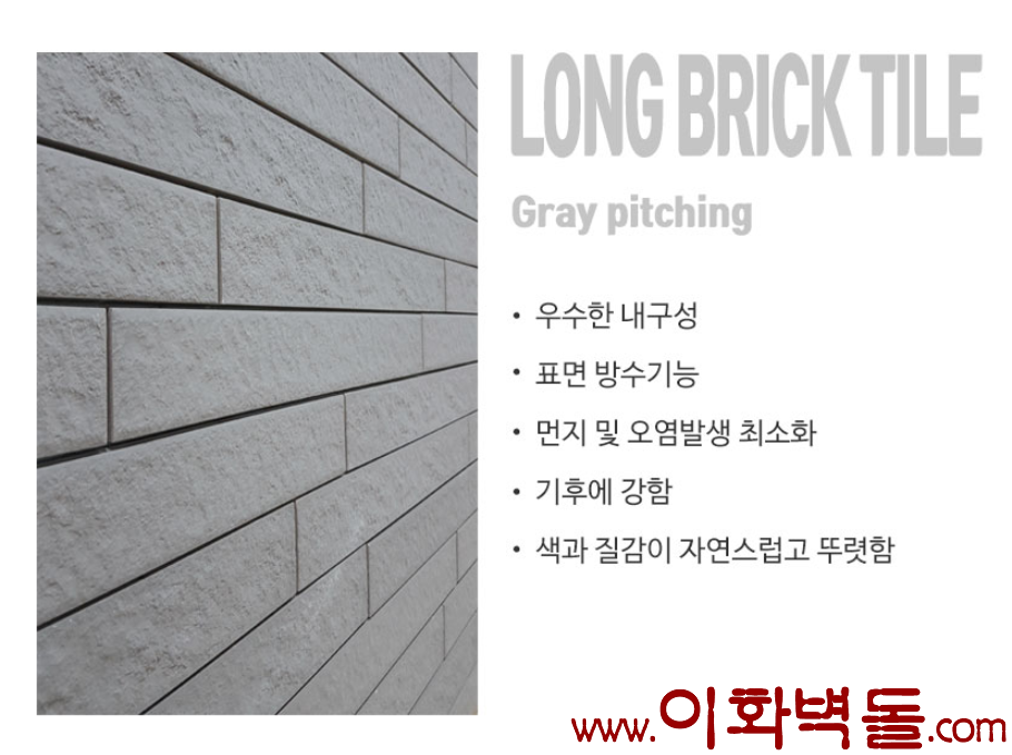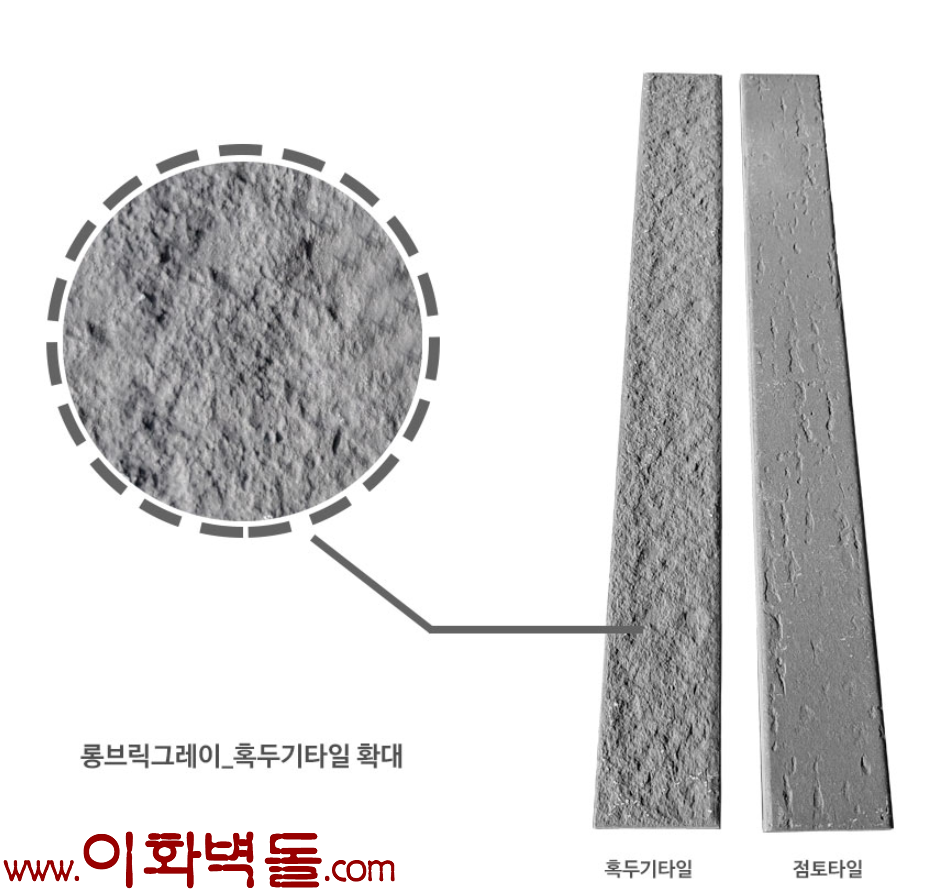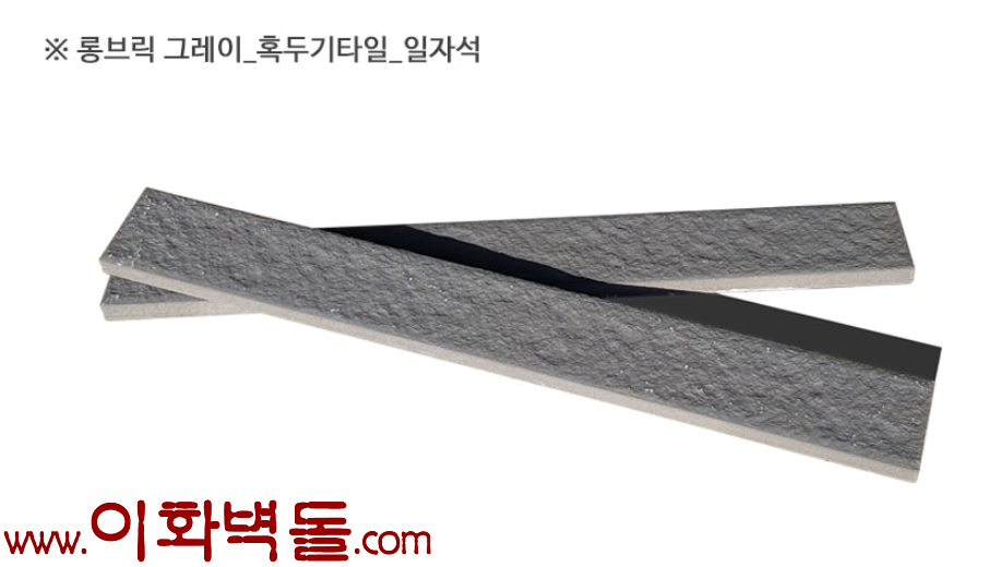 혹두기 그레이 롱브릭타일 타일규격 : 450x55x15 m²당 : 30장(줄눈15mm기준) 포장 : 1박스 - 30장/박스중량 18.5kg 코너타일규격 : 330x55x15 박스당 :28장/1.96m(줄눈15mm기준) 박스중량 16.5kg 용도 : 신축건물치장 / 건물외벽재시공 / 실내외인테리어