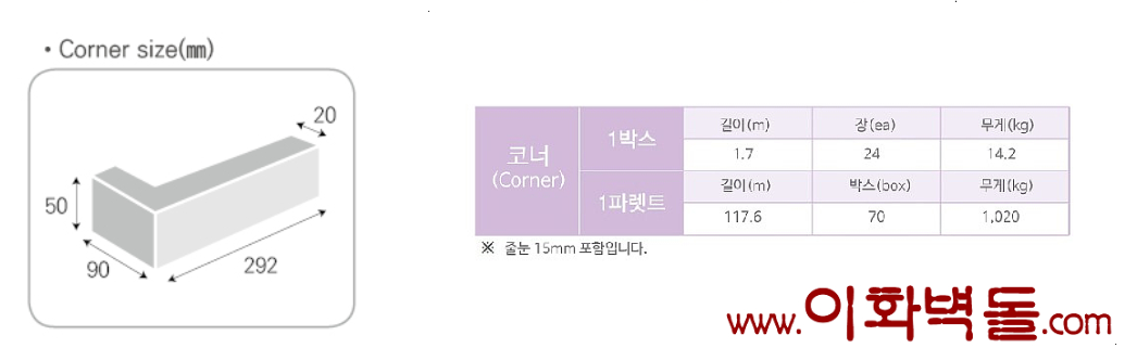 청고벽돌 롱브릭타일 타일규격 : 390x55x20 m²당 : 36장(줄눈15mm기준) 포장 : 1박스 m² / 박스중량 23kg 코너타일규격 : 292x90x55x20 박스당 :24장/1.7m(줄눈15mm기준) 박스중량 14.2kg 용도 : 신축건물치장 / 건물외벽재시공 / 실내외인테리어
