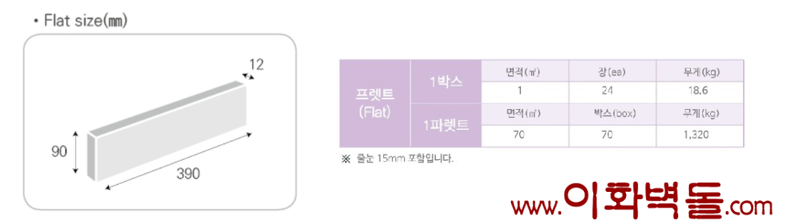 제품명 : 390 미장타일 브라운 타일규격 : 390×90×12 m²당 : 24장(줄눈15mm기준) / 1박스 / 24장(1m²) / 18.6kg 코너규격 : 292×90×90x12 (줄눈15mm기준) / 1박스 / 24장(2.5m) / 18kg 용도 : 신축건물치장 / 건물외벽 재시공 / 실내인테리어 특징 : 면이 고운 390사이즈 갈색의 점토타일