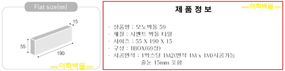 제품명 : 모노59블랙 모노59블랙타일 / 규격 : 190×55×15 m²당 : 69장(줄눈15mm기준) 1박스 / 69장(1m²) / 22kg - 1파렛트 / 60박스 / 1,340kg 용도 : 신축건물치장 / 건물외벽 재시공 / 실내인테리어 특징 : 벽돌의 자연스러운 면을 절단하여, 석재의 질감을 연출시킨 블랙모노타일제품