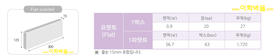 제품명 : 모노125화이트 모노125블랙타일 / 규격 : 300×125×15 m²당 : 20장(줄눈15mm기준) 1박스 / 20장(1m²) / 27kg - 1파렛트 / 63박스 / 1,720kg 용도 : 신축건물치장 / 건물외벽 재시공 / 실내인테리어 특징 : 벽돌의 자연스러운 면을 절단하여, 석재의 질감을 연출시킨 블럭모노타일제품