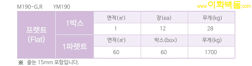 제품명 : 모노190레드 모노190레드타일 / 규격 : 390×190×15 m²당 : 12장(줄눈15mm기준) 1박스 / 12장(1m²) / 28kg - 1파렛트 / 60박스 / 1,700kg 용도 : 신축건물치장 / 건물외벽 재시공 / 실내인테리어 특징 : 벽돌의 자연스러운 면을 절단하여, 석재의 질감을 연출시킨 390블럭모노타일제품