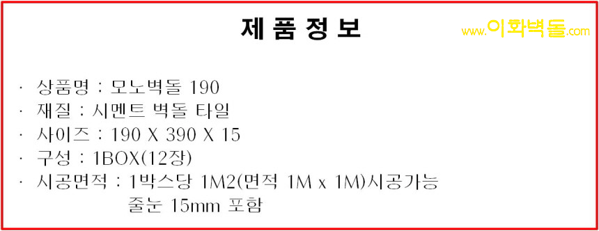 제품명 : 모노190그레이 모노190그레이타일 / 규격 : 390×190×15 m²당 : 12장(줄눈15mm기준) 1박스 / 12장(1m²) / 28kg - 1파렛트 / 60박스 / 1,700kg 용도 : 신축건물치장 / 건물외벽 재시공 / 실내인테리어 특징 : 벽돌의 자연스러운 면을 절단하여, 석재의 질감을 연출시킨 390블럭모노타일제품