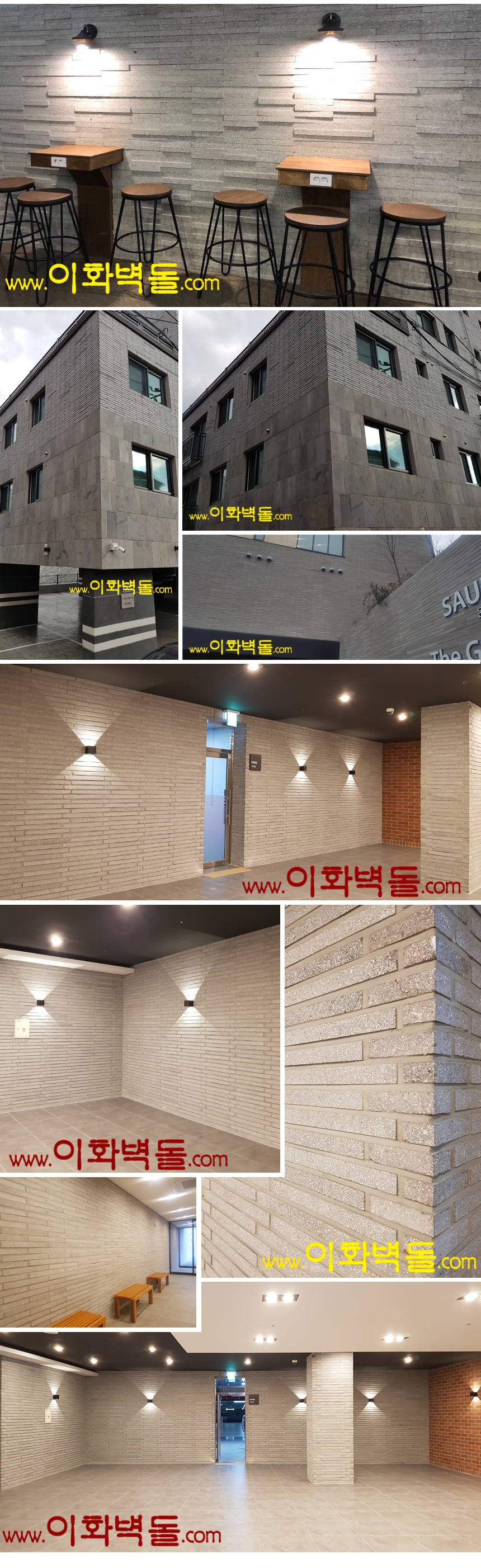 특징 : 벽돌의 자연스러운 면을 절단하여 만든 모노롱브릭은 기다란 타일의 안정된 모양이 장점입니다.