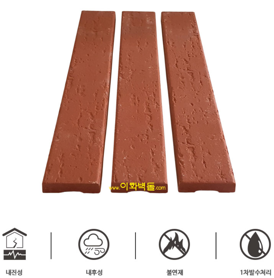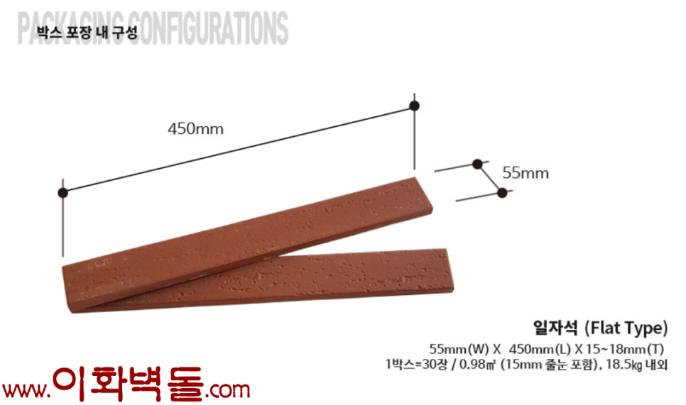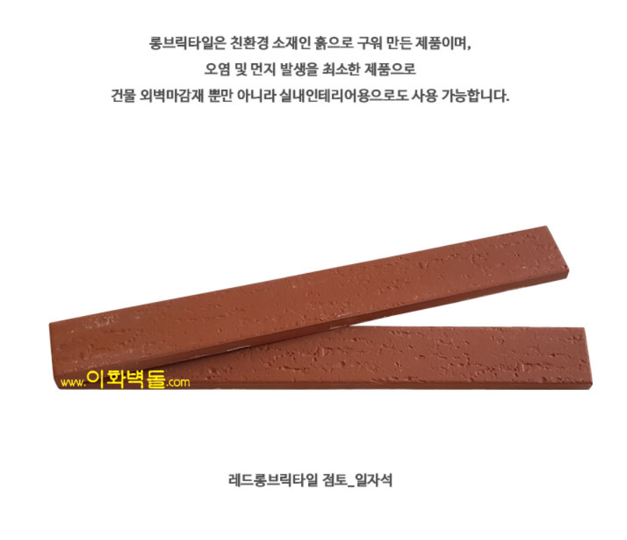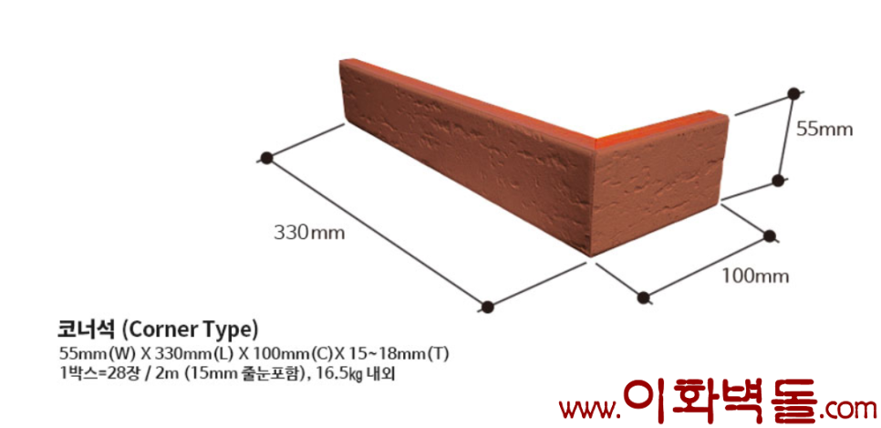레드 롱브릭타일 SIZE : 450x55x15~18T 1박스당 / 30장 / 18.5kg / 0.98m² (줄눈15mm기준) 레드 롱브릭코너타일 SIZE : 330x55x100x15~18T 1박스당 / 28장 / 16.5kg / 2m (줄눈15mm기준)