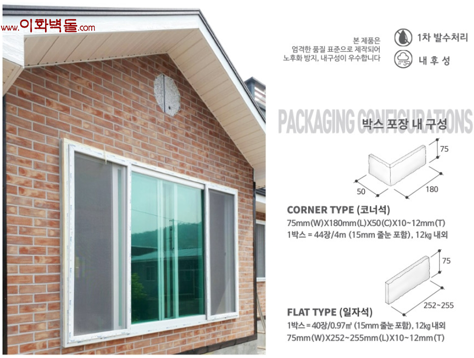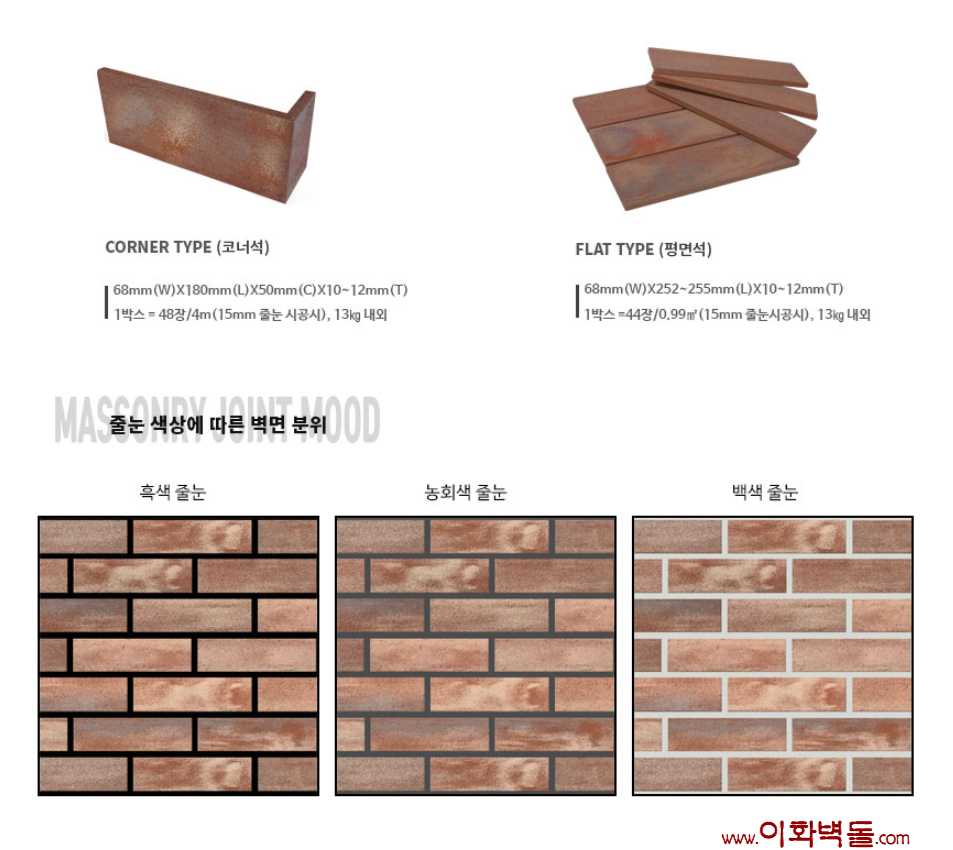 점토타일 브라운골드 68사이즈 : 255x68x10t m²/1박스/44장/13kg 68 코너 : 180x68x50x10t 1박스/48장/4m/13kg 10여 가지의 메지(줄눈시멘트) 칼라로 다양한 시공패턴 연출, 메지(줄눈시멘트) 차이로 다른 분위기를 냅니다.