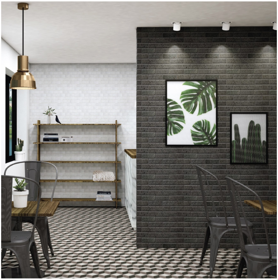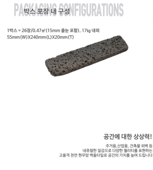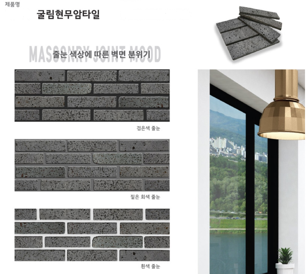 B굴림 현무암 타일 SIZE : 240x55x20t 1box=52장/0.93m²(15mm줄눈포함), 1box당33kg 10여 가지의 메지(줄눈시멘트) 칼라로 다양한 시공패턴 연출, 메지(줄눈시멘트) 차이로 다른 분위기를 냅니다.