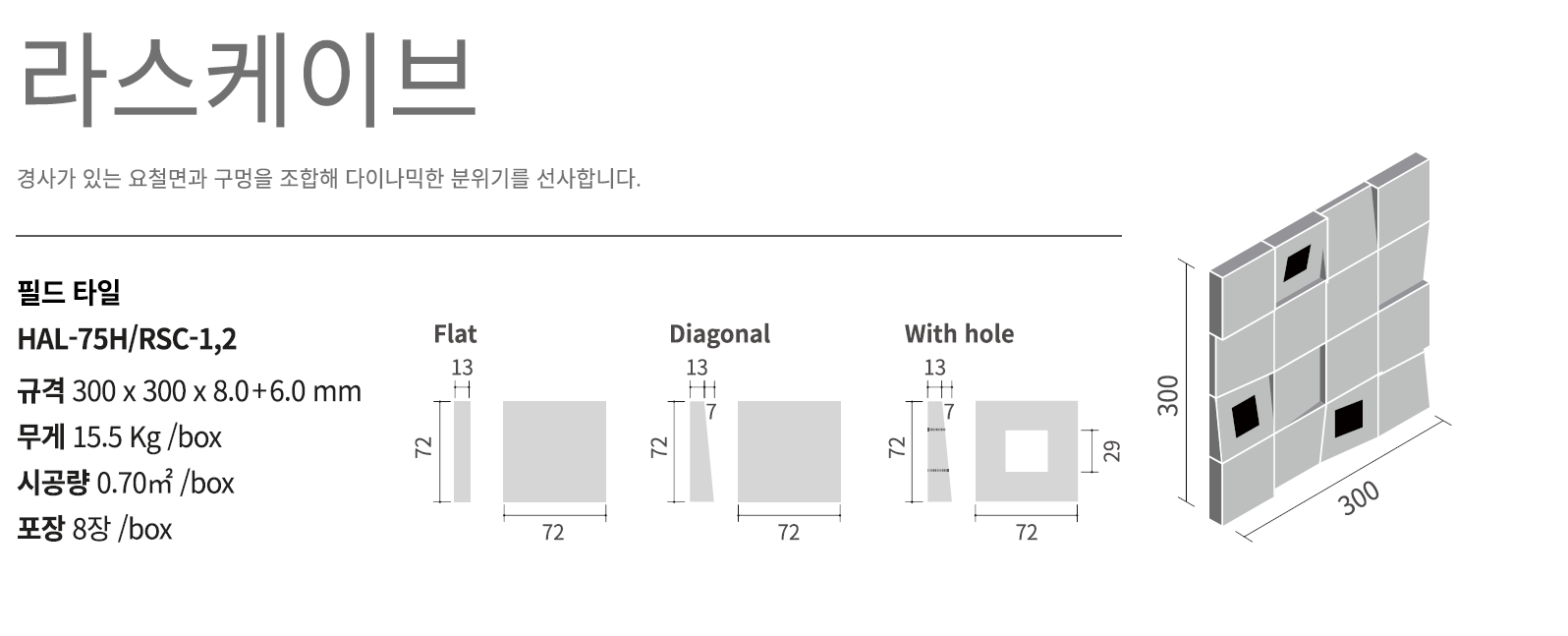 빛의 흐름에 따라 연출되는 다양한 분위기. 경사가 있는 요철면과 구멍을 조합해 다이나믹한 분위기를 선사합니다. [이 게시물은 이화적벽돌님에 의해 2023-04-03 09:47:55 타일벽돌에서 이동 됨] [이 게시물은 이화적벽돌님에 의해 2023-04-03 09:49:23 바닥벽돌에서 이동 됨]