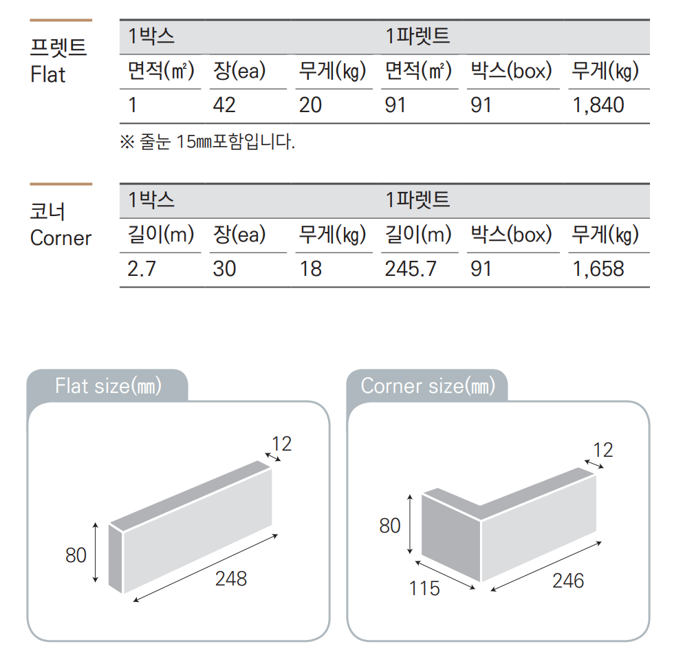 레드피안점토화이트 타일규격 : 248x80x12T 박스 당 / 1m² / 42장 / 20kg / 1p / 91박스 / 91m² / 1.840kg 코너규격 : 246x115x80x12T 박스 당 / 2.7m / 30장 / 18kg / 1p / 91박스 / 245.7m / 1.658kg