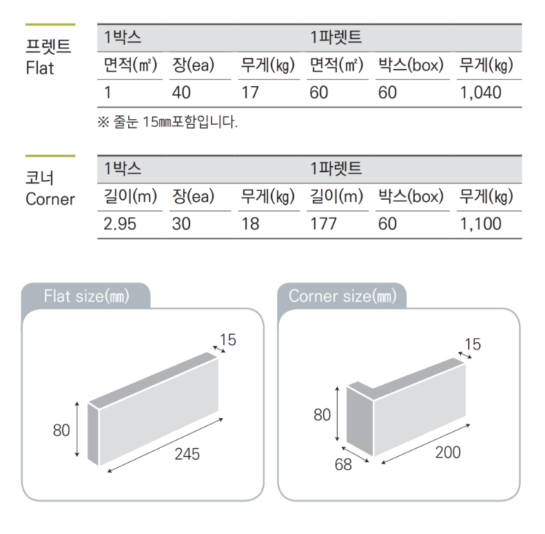 클락필드 타일규격 : 245x80x15T 박스 당 / 1m² / 40장 / 17kg / 1p / 60박스 / 60m² / 1.040kg 코너규격 : 200x68x80x15T 박스 당 / 2.95m / 30장 / 18kg / 1p / 60박스 / 177m / 1.100kg