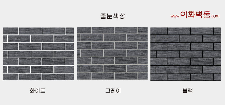 10여 가지의 메지(줄눈시멘트) 칼라로 다양한 시공패턴 연출, 줄눈시멘트 차이로 다른 분위기를 냅니다.