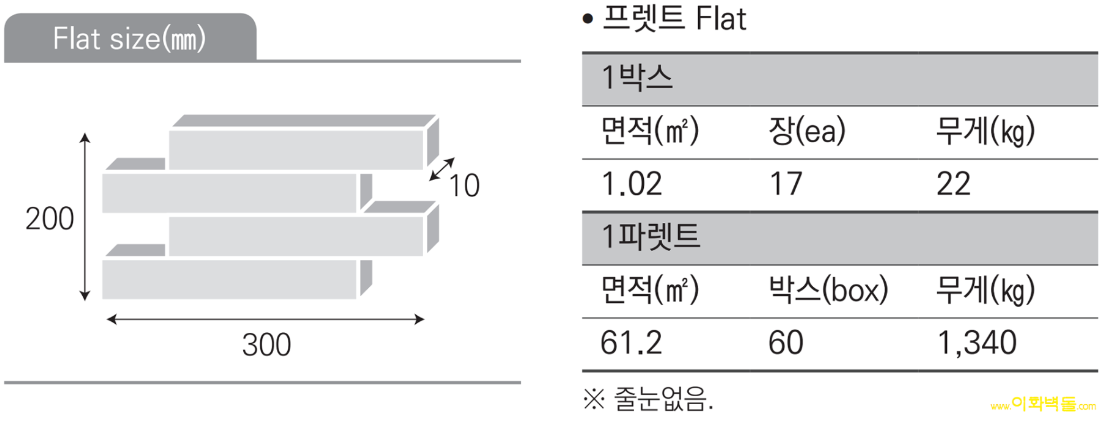 제품명 : 파케이스틱 믹스 규격 : 300x200x10mm / 1box = 17장 = 1.02m² / box 중량 22kg / 1p / 61.2m² / 60박스 1,340kg 색상 : 화이트 / 믹스