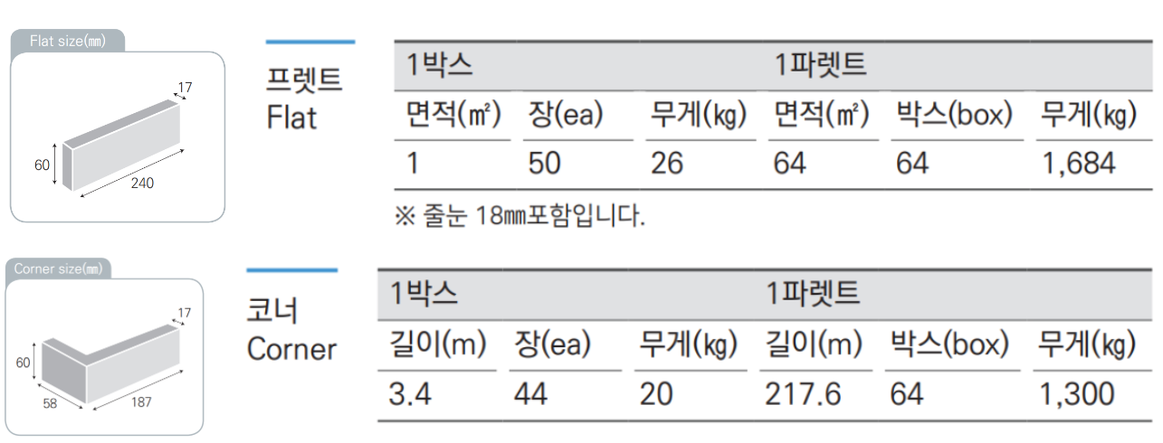 코너 SIZE : 187x58x60x17T m²/44장 (줄눈18mm기준)