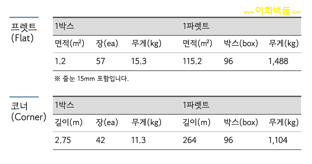 1박스 / 57장(1.2m²) / 15.3kg - 1파렛트 / 96박스(115.2m²) / 1,488kg