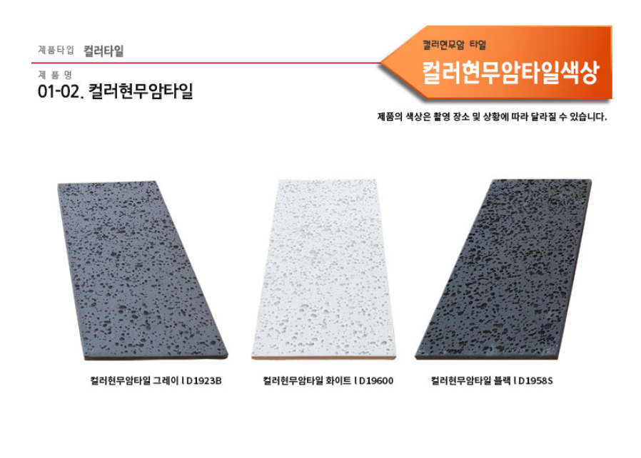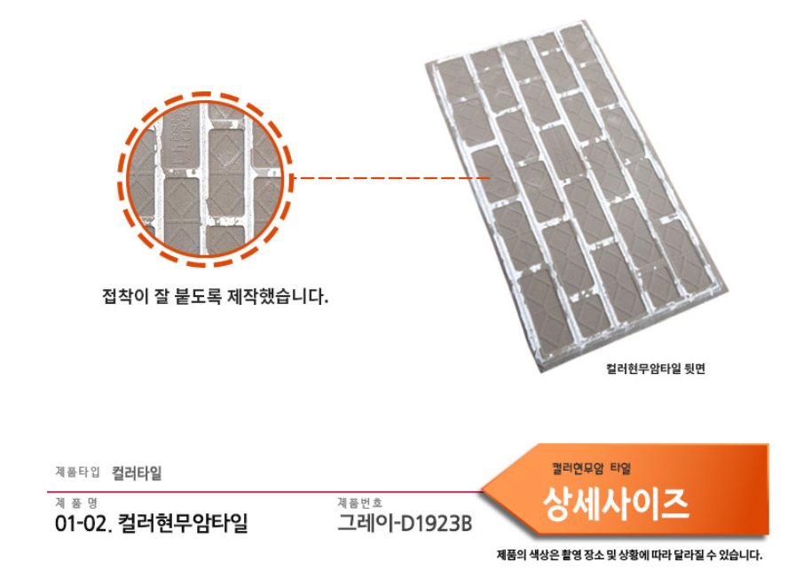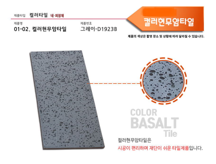 컬러현무암타일 그레이 SIZE : 390 x 190 x 15T m²/12장 1박스당 / 12장 / 20kg / 0.98m² (줄눈15mm기준) 10여 가지의 메지(줄눈시멘트) 칼라로 다양한 시공패턴 연출, 메지(줄눈시멘트) 차이로 다른 분위기를 냅니다.