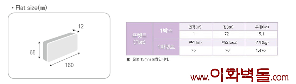 몽당벽돌타일 백고벽돌 타일규격 : 160x65x12 m²당 : 72장(줄눈15mm기준) 포장 : 1박스 m² / 박스중량 15.1kg 용도 : 신축건물치장 / 건물외벽재시공 / 실내외인테리어