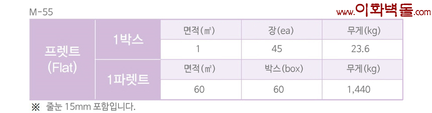 1박스 / 45장(1m²) / 23.6kg - 1파렛트 / 60박스 / 1,440kg