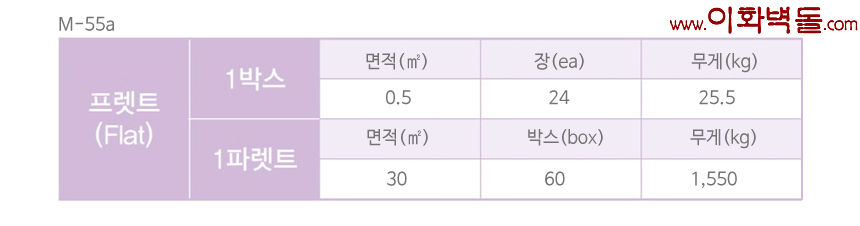 1박스 / 24장(0.5m²) / 25.5kg - 1파렛트 / 60박스 / 1,550kg