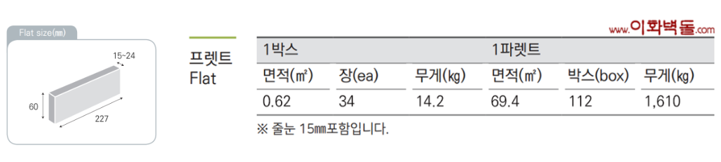 제품명 : 스톤타일W 규격 : 227x60x15~24 m²당 : 19장 1box 34장 1박스당 0.62헤배 14.2kg 1p 112box 69.4헤배 1p 중량 1,610kg